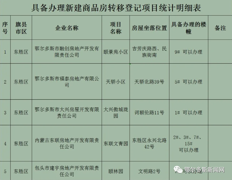按照《鄂尔多斯市人民政府关于解决城镇国有土地上房屋权属登记等历史遗留问题有关事宜的通知》(鄂府发〔2019〕100号)的文件精神,为进一步解决城镇国有土地上房屋权属登记等历史遗留问题,切实保障广大群众合法权益,尽快办理老百姓房屋产权登记手续,特通知以下小区可以由开发企业和购房人持相关转移登记申请材料,共同到不动产登记大厅办理房屋产权登记手续,小区名单详见下表: